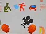Avec l’artiste, en se servant de pictogrammes sélectionnés dans l’environnement proche, les élèves ont raconté des histoires sous la forme d’affiches et investi (du badge aux autocollants sur les portes des toilettes), l’ensemble de l’établissement de leurs propres pictogrammes.