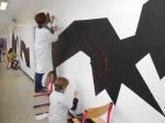 Avec l’artiste plasticienne, sur un mur d’un passage lumineux de la Cité scolaire visible de la rue, les élèves ont méthodiquement conçu et réalisé une fresque dans un style géométrique et abstrait.